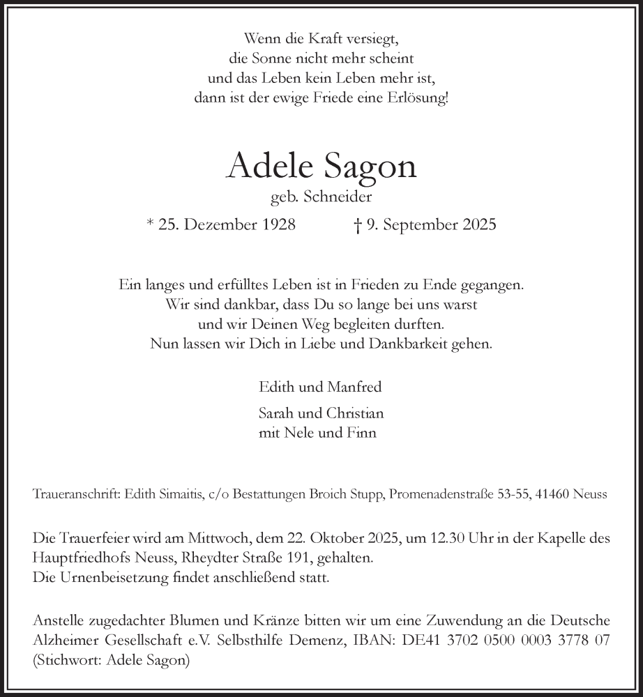 Hier finden Sie alle Traueranzeigen aus der Zeitung, die bisher für Adele Sagon erschienen sind. Weitere Traueranzeigen, die in der Zeitung erscheinen, werden hier ebenfalls aufgelistet