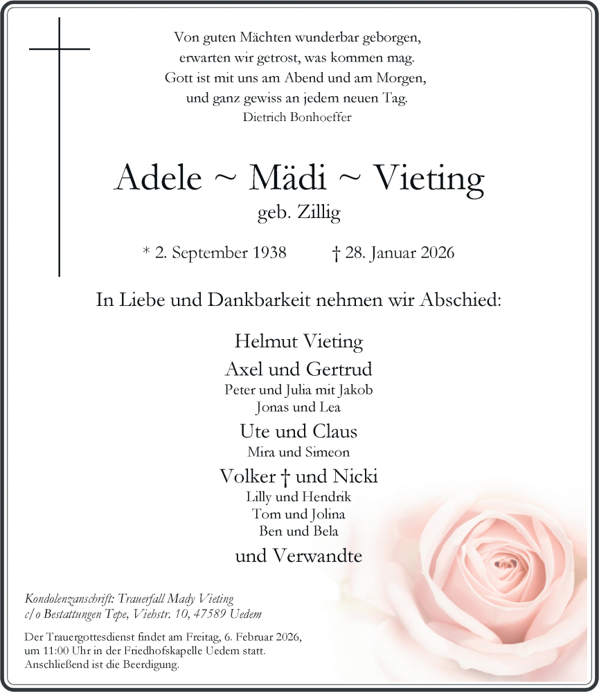 Hier finden Sie alle Traueranzeigen aus der Zeitung, die bisher für Adele Vieting erschienen sind. Weitere Traueranzeigen, die in der Zeitung erscheinen, werden hier ebenfalls aufgelistet