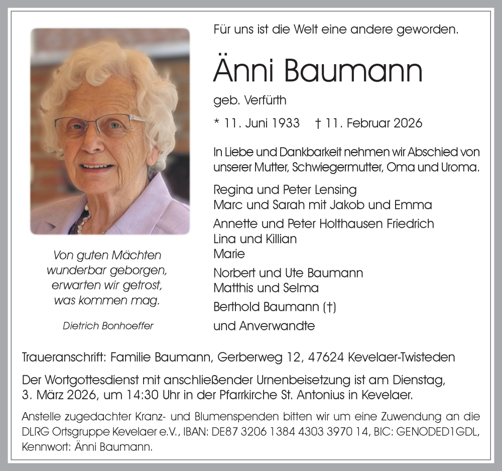Hier finden Sie alle Traueranzeigen aus der Zeitung, die bisher für Änni Baumann erschienen sind. Weitere Traueranzeigen, die in der Zeitung erscheinen, werden hier ebenfalls aufgelistet