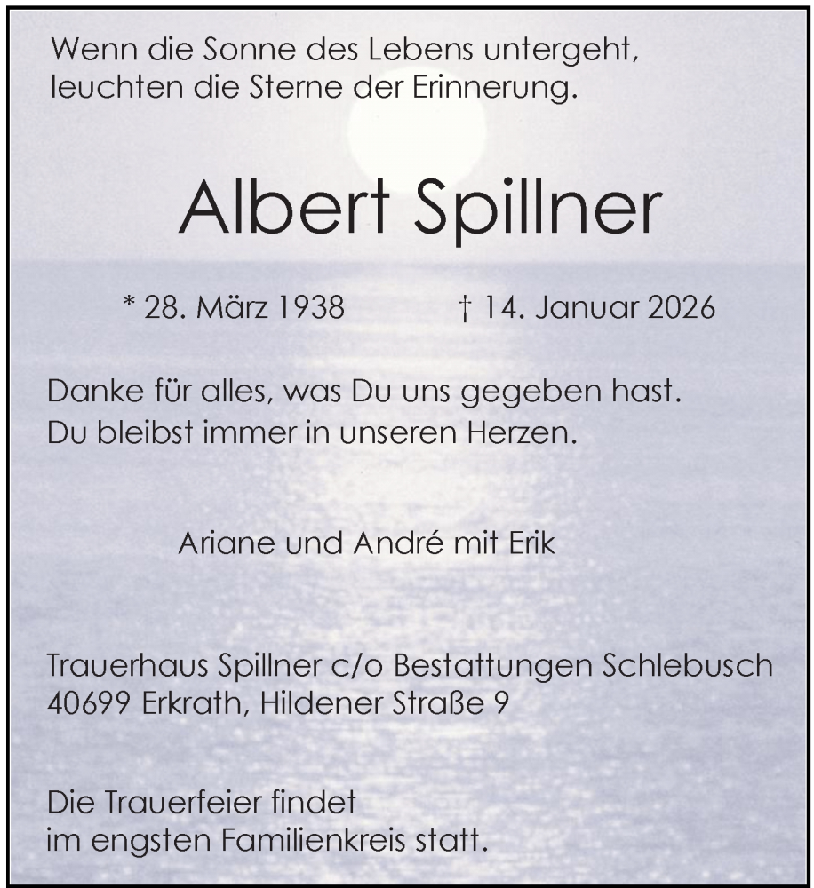 Hier finden Sie alle Traueranzeigen aus der Zeitung, die bisher für Albert Spillner erschienen sind. Weitere Traueranzeigen, die in der Zeitung erscheinen, werden hier ebenfalls aufgelistet