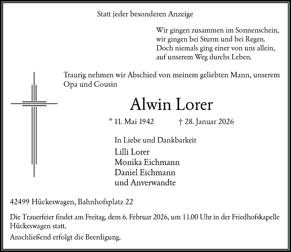 Hier finden Sie alle Traueranzeigen aus der Zeitung, die bisher für Alwin Lorer erschienen sind. Weitere Traueranzeigen, die in der Zeitung erscheinen, werden hier ebenfalls aufgelistet