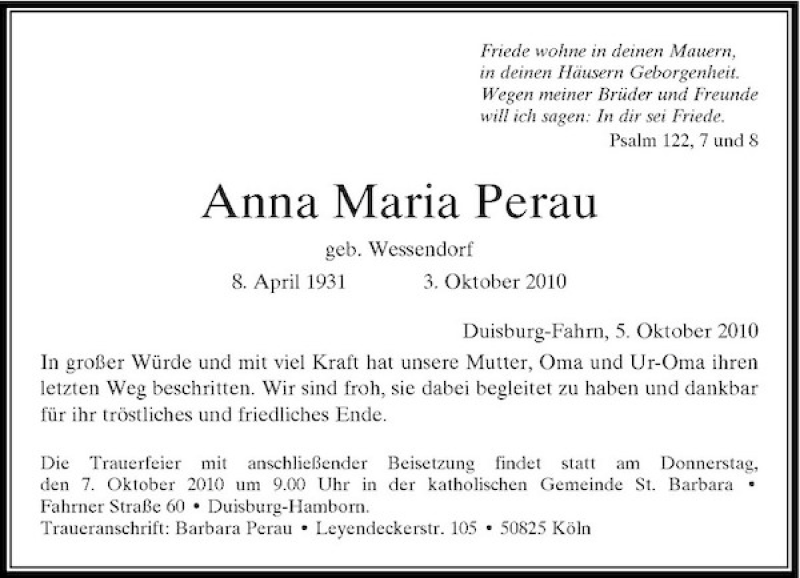 Hier finden Sie alle Traueranzeigen aus der Zeitung, die bisher für Anna Maria Perau erschienen sind. Weitere Traueranzeigen, die in der Zeitung erscheinen, werden hier ebenfalls aufgelistet