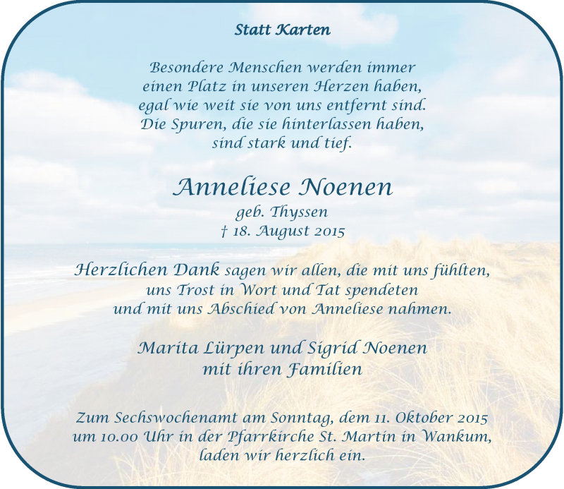 Hier finden Sie alle Traueranzeigen aus der Zeitung, die bisher für Anneliese Noenen erschienen sind. Weitere Traueranzeigen, die in der Zeitung erscheinen, werden hier ebenfalls aufgelistet