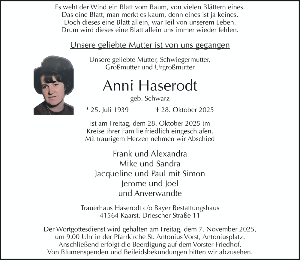 Hier finden Sie alle Traueranzeigen aus der Zeitung, die bisher für Anni Haserodt erschienen sind. Weitere Traueranzeigen, die in der Zeitung erscheinen, werden hier ebenfalls aufgelistet
