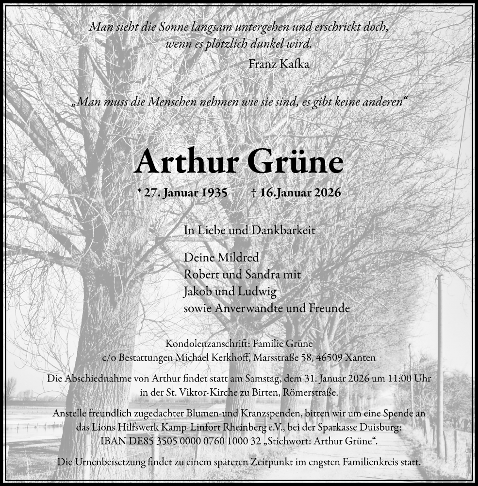 Hier finden Sie alle Traueranzeigen aus der Zeitung, die bisher für Arthur Grüne erschienen sind. Weitere Traueranzeigen, die in der Zeitung erscheinen, werden hier ebenfalls aufgelistet