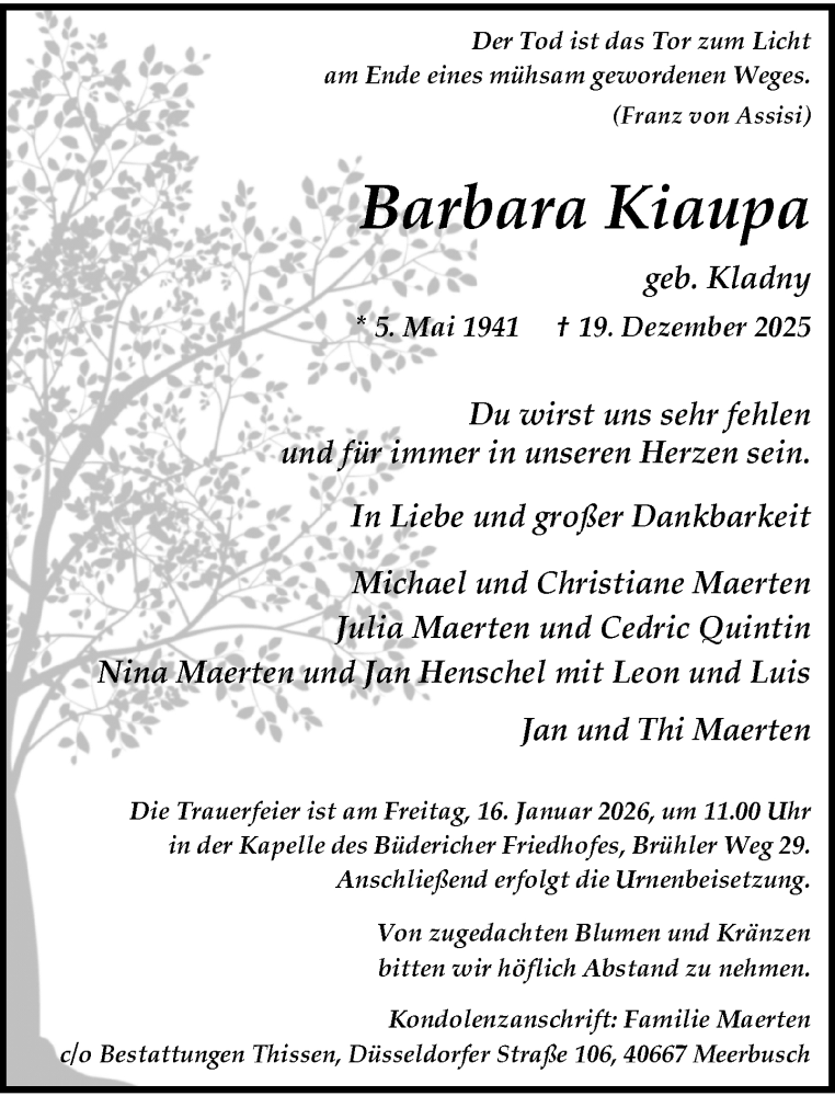 Hier finden Sie alle Traueranzeigen aus der Zeitung, die bisher für Barbara Kiaupa erschienen sind. Weitere Traueranzeigen, die in der Zeitung erscheinen, werden hier ebenfalls aufgelistet