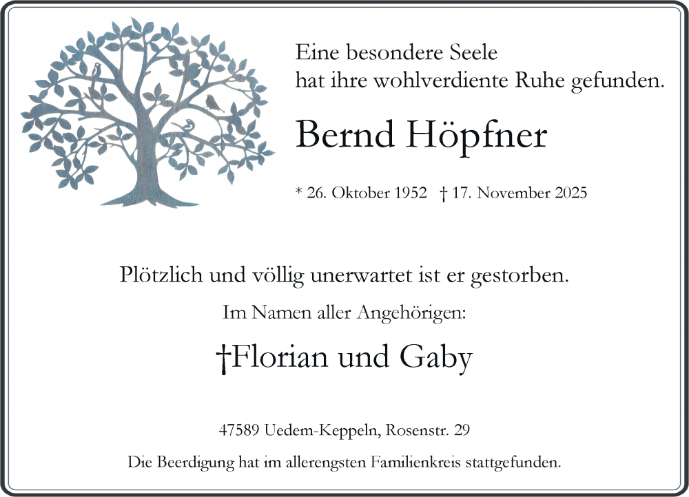 Hier finden Sie alle Traueranzeigen aus der Zeitung, die bisher für Bernd Höpfner erschienen sind. Weitere Traueranzeigen, die in der Zeitung erscheinen, werden hier ebenfalls aufgelistet