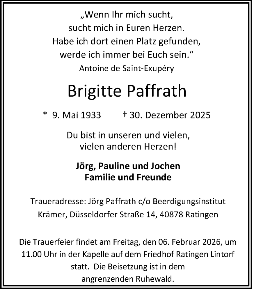 Hier finden Sie alle Traueranzeigen aus der Zeitung, die bisher für Brigitte Paffrath erschienen sind. Weitere Traueranzeigen, die in der Zeitung erscheinen, werden hier ebenfalls aufgelistet