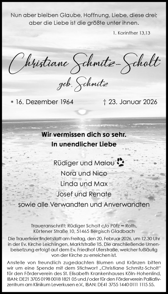 Hier finden Sie alle Traueranzeigen aus der Zeitung, die bisher für Christiane Schmitz-Scholt erschienen sind. Weitere Traueranzeigen, die in der Zeitung erscheinen, werden hier ebenfalls aufgelistet