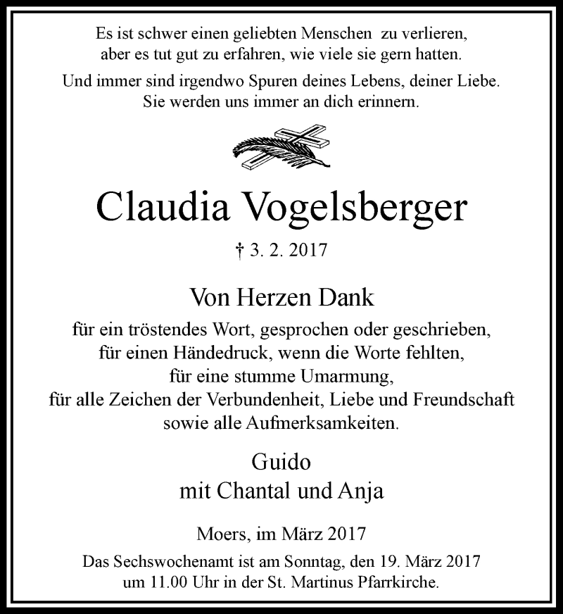 Hier finden Sie alle Traueranzeigen aus der Zeitung, die bisher für Claudia Vogelsberger erschienen sind. Weitere Traueranzeigen, die in der Zeitung erscheinen, werden hier ebenfalls aufgelistet