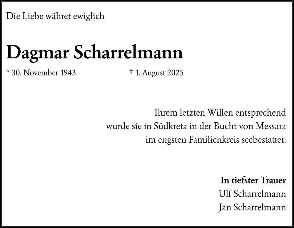 Hier finden Sie alle Traueranzeigen aus der Zeitung, die bisher für Dagmar Scharrelmann erschienen sind. Weitere Traueranzeigen, die in der Zeitung erscheinen, werden hier ebenfalls aufgelistet