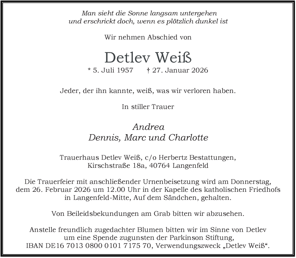Hier finden Sie alle Traueranzeigen aus der Zeitung, die bisher für Detlev Weiß erschienen sind. Weitere Traueranzeigen, die in der Zeitung erscheinen, werden hier ebenfalls aufgelistet