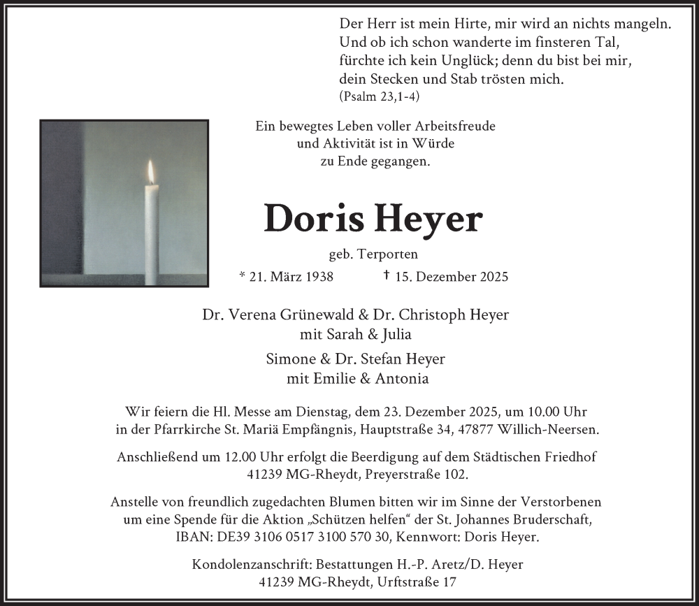Hier finden Sie alle Traueranzeigen aus der Zeitung, die bisher für Doris Heyer erschienen sind. Weitere Traueranzeigen, die in der Zeitung erscheinen, werden hier ebenfalls aufgelistet