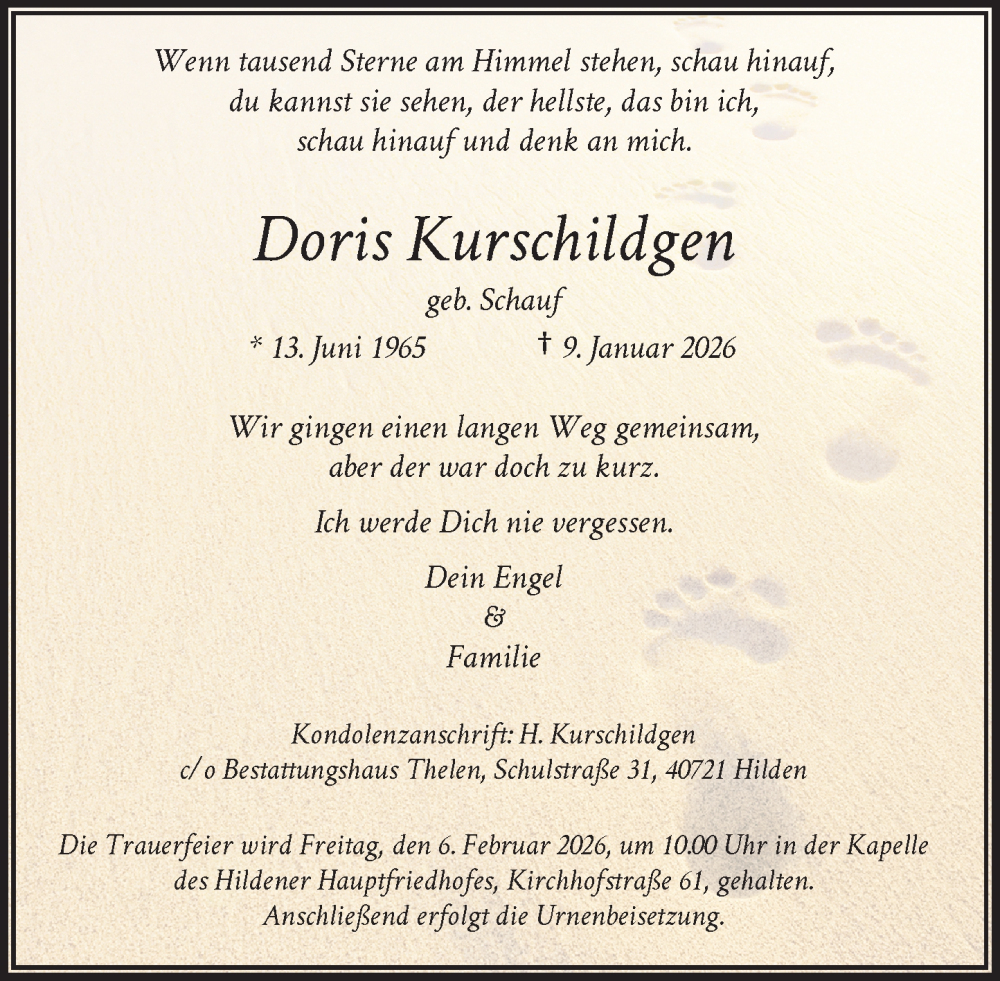 Hier finden Sie alle Traueranzeigen aus der Zeitung, die bisher für Doris Kurschildgen erschienen sind. Weitere Traueranzeigen, die in der Zeitung erscheinen, werden hier ebenfalls aufgelistet