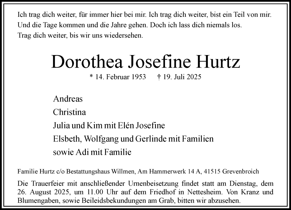 Hier finden Sie alle Traueranzeigen aus der Zeitung, die bisher für Dorothea Josefine Hurtz erschienen sind. Weitere Traueranzeigen, die in der Zeitung erscheinen, werden hier ebenfalls aufgelistet
