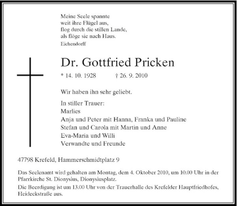 Hier finden Sie alle Traueranzeigen aus der Zeitung, die bisher für Dr. Gottfried Pricken erschienen sind. Weitere Traueranzeigen, die in der Zeitung erscheinen, werden hier ebenfalls aufgelistet