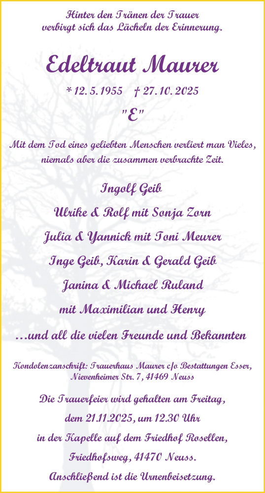 Hier finden Sie alle Traueranzeigen aus der Zeitung, die bisher für Edeltraut Maurer erschienen sind. Weitere Traueranzeigen, die in der Zeitung erscheinen, werden hier ebenfalls aufgelistet