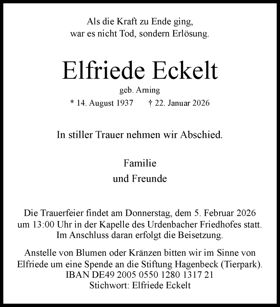 Hier finden Sie alle Traueranzeigen aus der Zeitung, die bisher für Elfriede Eckelt erschienen sind. Weitere Traueranzeigen, die in der Zeitung erscheinen, werden hier ebenfalls aufgelistet