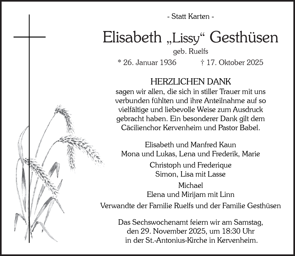 Hier finden Sie alle Traueranzeigen aus der Zeitung, die bisher für Elisabeth Gesthüsen erschienen sind. Weitere Traueranzeigen, die in der Zeitung erscheinen, werden hier ebenfalls aufgelistet