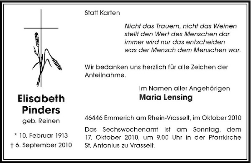Hier finden Sie alle Traueranzeigen aus der Zeitung, die bisher für Elisabeth Pinders erschienen sind. Weitere Traueranzeigen, die in der Zeitung erscheinen, werden hier ebenfalls aufgelistet