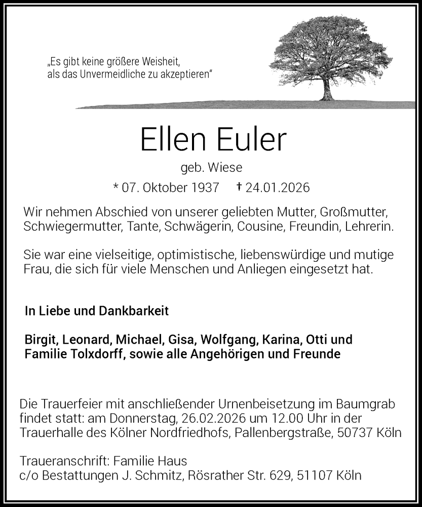 Hier finden Sie alle Traueranzeigen aus der Zeitung, die bisher für Ellen Euler erschienen sind. Weitere Traueranzeigen, die in der Zeitung erscheinen, werden hier ebenfalls aufgelistet