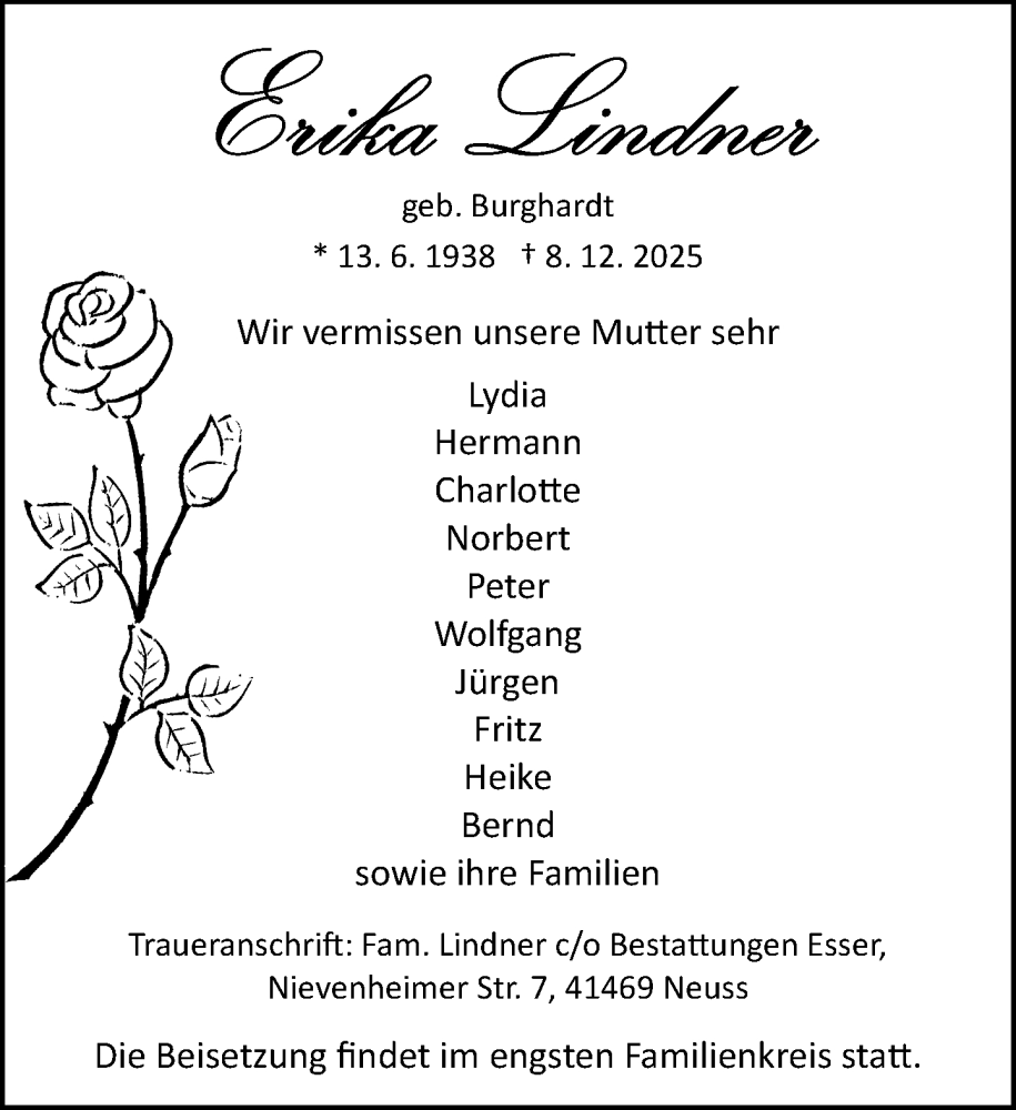 Hier finden Sie alle Traueranzeigen aus der Zeitung, die bisher für Erika Lindner erschienen sind. Weitere Traueranzeigen, die in der Zeitung erscheinen, werden hier ebenfalls aufgelistet