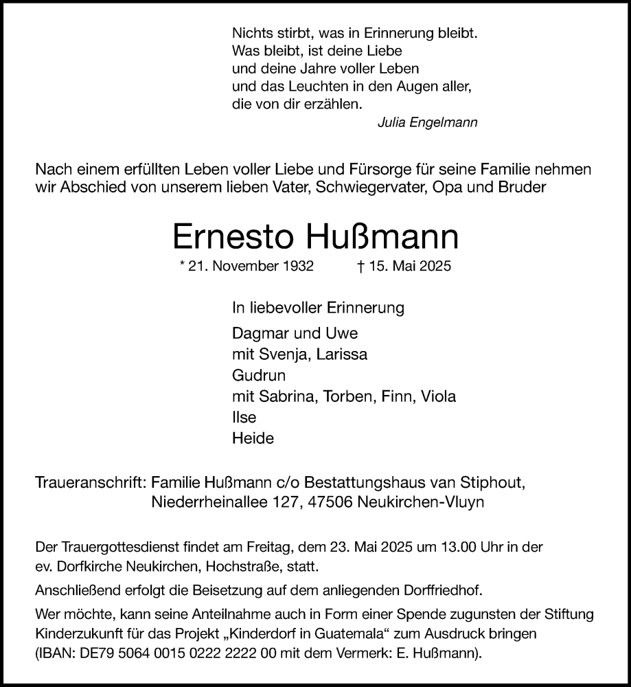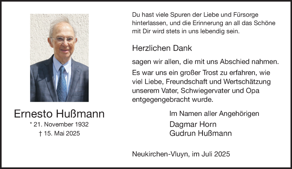 Hier finden Sie alle Traueranzeigen aus der Zeitung, die bisher für Ernesto Hußmann erschienen sind. Weitere Traueranzeigen, die in der Zeitung erscheinen, werden hier ebenfalls aufgelistet
