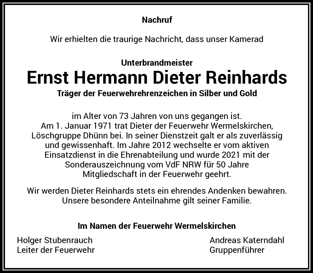 Hier finden Sie alle Traueranzeigen aus der Zeitung, die bisher für Ernst Hermann Dieter Reinhards erschienen sind. Weitere Traueranzeigen, die in der Zeitung erscheinen, werden hier ebenfalls aufgelistet