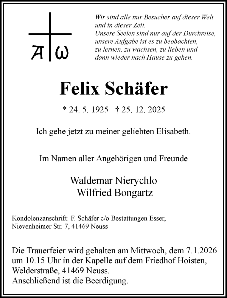 Hier finden Sie alle Traueranzeigen aus der Zeitung, die bisher für Felix Schäfer erschienen sind. Weitere Traueranzeigen, die in der Zeitung erscheinen, werden hier ebenfalls aufgelistet
