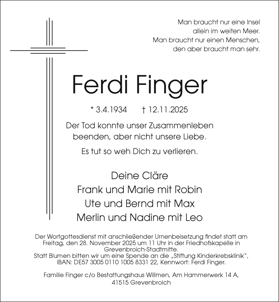 Hier finden Sie alle Traueranzeigen aus der Zeitung, die bisher für Ferdi Finger erschienen sind. Weitere Traueranzeigen, die in der Zeitung erscheinen, werden hier ebenfalls aufgelistet