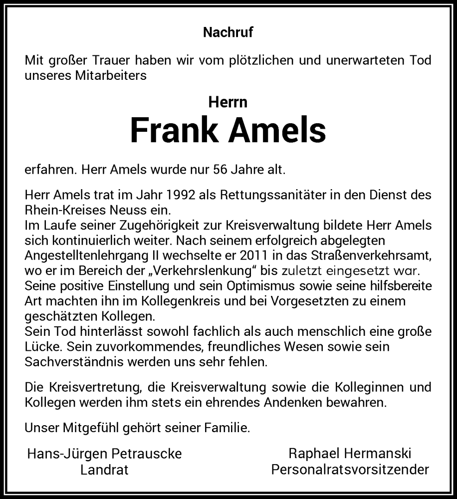 Hier finden Sie alle Traueranzeigen aus der Zeitung, die bisher für Frank Amels erschienen sind. Weitere Traueranzeigen, die in der Zeitung erscheinen, werden hier ebenfalls aufgelistet
