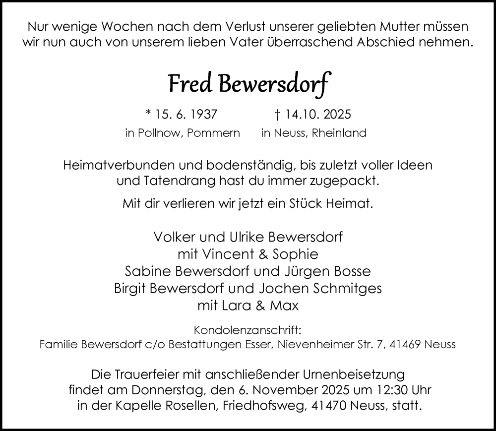 Hier finden Sie alle Traueranzeigen aus der Zeitung, die bisher für Fred Bewersdorf erschienen sind. Weitere Traueranzeigen, die in der Zeitung erscheinen, werden hier ebenfalls aufgelistet