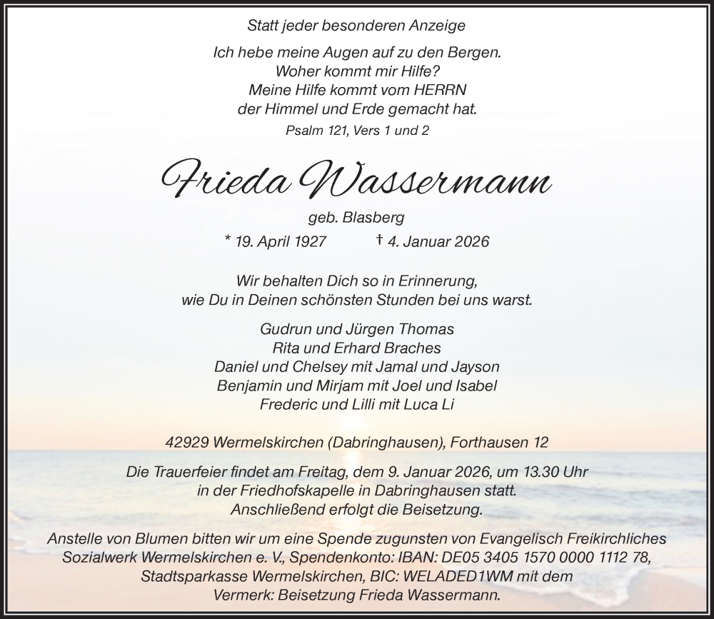 Hier finden Sie alle Traueranzeigen aus der Zeitung, die bisher für Frieda Wassermann erschienen sind. Weitere Traueranzeigen, die in der Zeitung erscheinen, werden hier ebenfalls aufgelistet