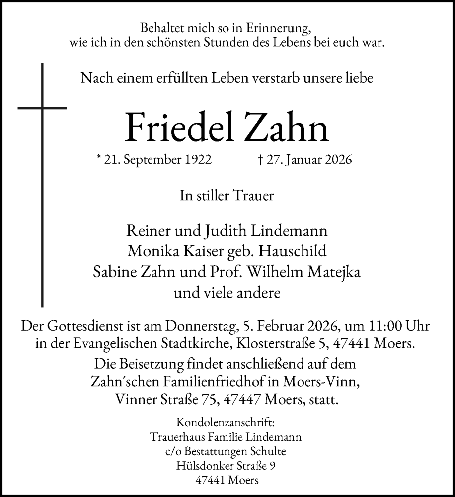 Hier finden Sie alle Traueranzeigen aus der Zeitung, die bisher für Friedel Zahn erschienen sind. Weitere Traueranzeigen, die in der Zeitung erscheinen, werden hier ebenfalls aufgelistet