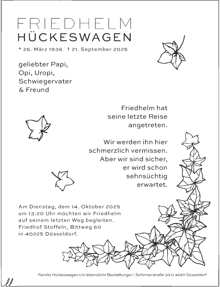 Hier finden Sie alle Traueranzeigen aus der Zeitung, die bisher für Friedhelm Hückeswagen erschienen sind. Weitere Traueranzeigen, die in der Zeitung erscheinen, werden hier ebenfalls aufgelistet