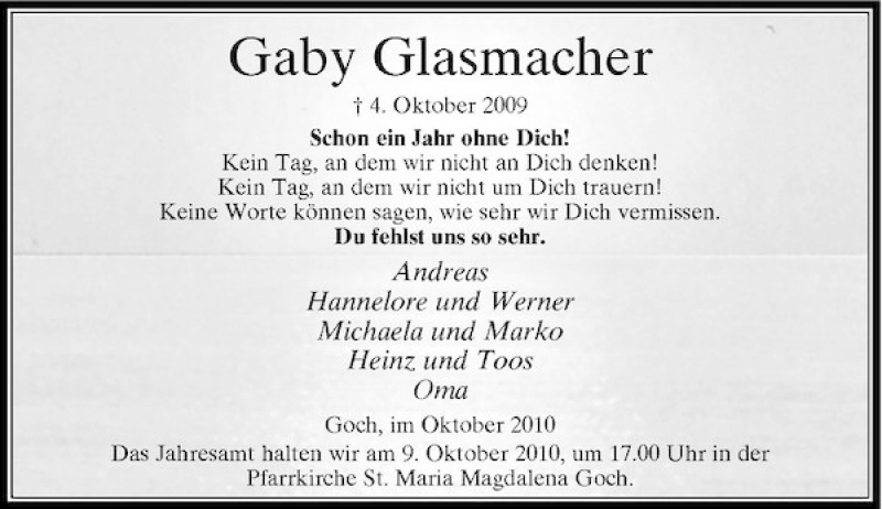 Hier finden Sie alle Traueranzeigen aus der Zeitung, die bisher für Gaby Glasmacher erschienen sind. Weitere Traueranzeigen, die in der Zeitung erscheinen, werden hier ebenfalls aufgelistet