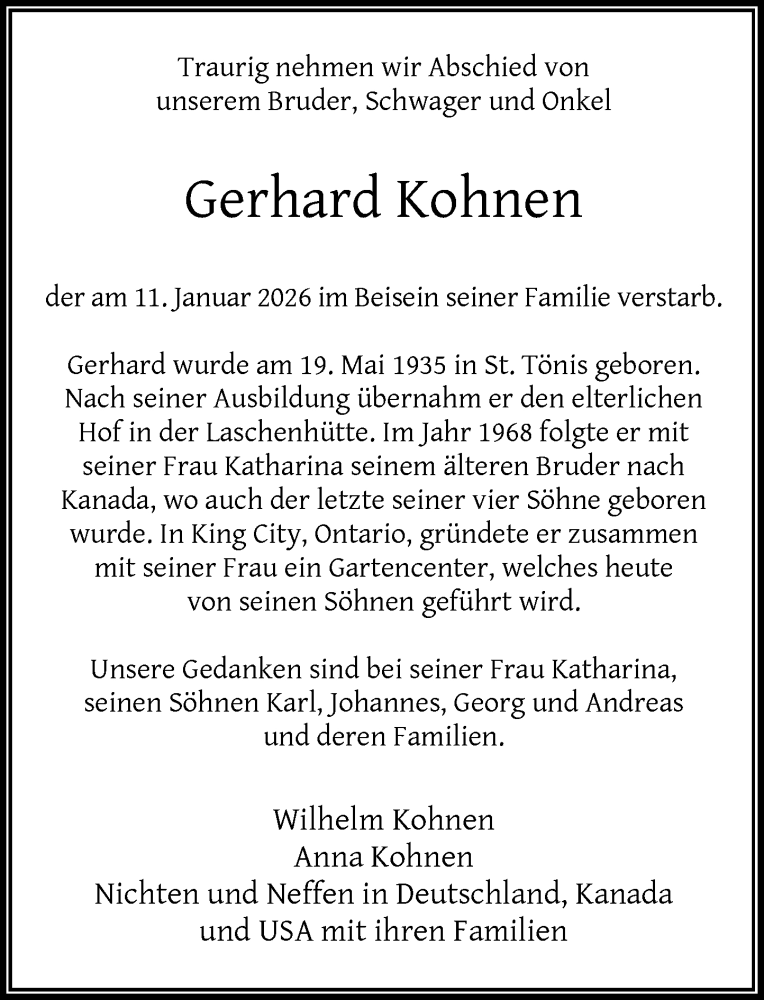 Hier finden Sie alle Traueranzeigen aus der Zeitung, die bisher für Gerhard Kohnen erschienen sind. Weitere Traueranzeigen, die in der Zeitung erscheinen, werden hier ebenfalls aufgelistet