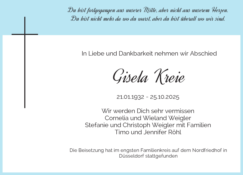 Hier finden Sie alle Traueranzeigen aus der Zeitung, die bisher für Gisela Kreie erschienen sind. Weitere Traueranzeigen, die in der Zeitung erscheinen, werden hier ebenfalls aufgelistet
