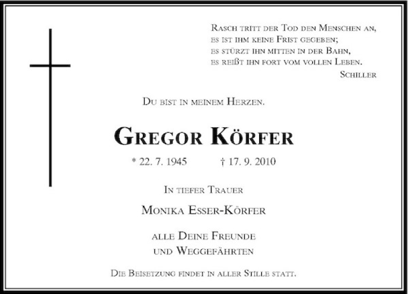 Hier finden Sie alle Traueranzeigen aus der Zeitung, die bisher für GREGOR KÖRFER erschienen sind. Weitere Traueranzeigen, die in der Zeitung erscheinen, werden hier ebenfalls aufgelistet