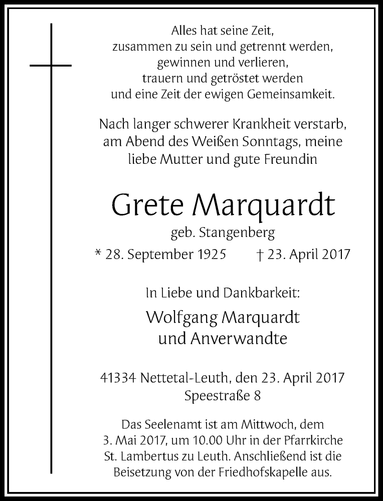 Hier finden Sie alle Traueranzeigen aus der Zeitung, die bisher für Grete Marquardt erschienen sind. Weitere Traueranzeigen, die in der Zeitung erscheinen, werden hier ebenfalls aufgelistet