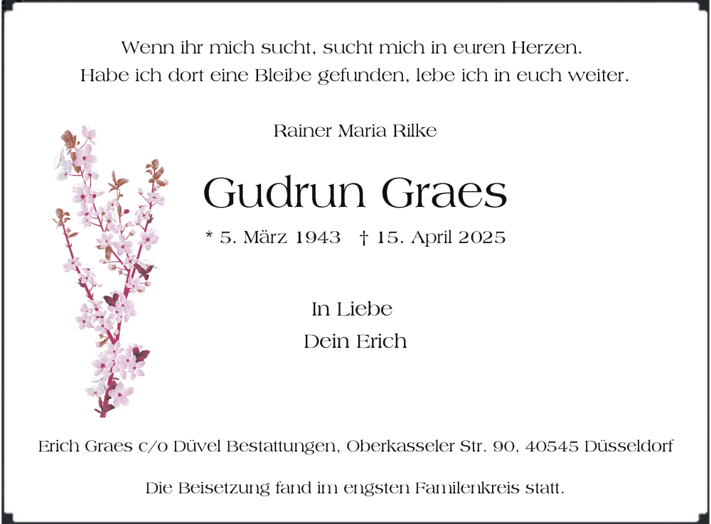 Hier finden Sie alle Traueranzeigen aus der Zeitung, die bisher für Gudrun Graes erschienen sind. Weitere Traueranzeigen, die in der Zeitung erscheinen, werden hier ebenfalls aufgelistet
