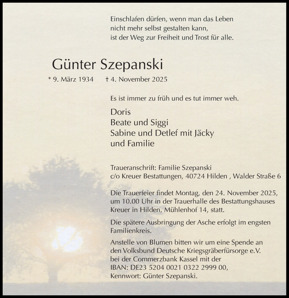 Hier finden Sie alle Traueranzeigen aus der Zeitung, die bisher für Günter Szepanski erschienen sind. Weitere Traueranzeigen, die in der Zeitung erscheinen, werden hier ebenfalls aufgelistet