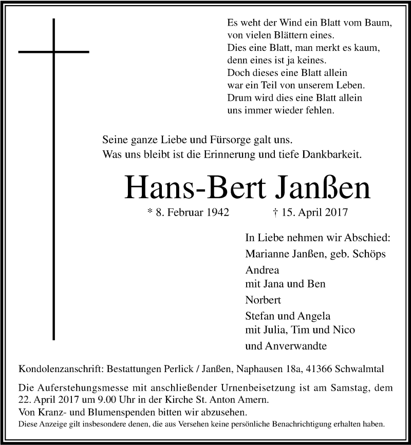 Hier finden Sie alle Traueranzeigen aus der Zeitung, die bisher für Hans-Bert Janßen erschienen sind. Weitere Traueranzeigen, die in der Zeitung erscheinen, werden hier ebenfalls aufgelistet