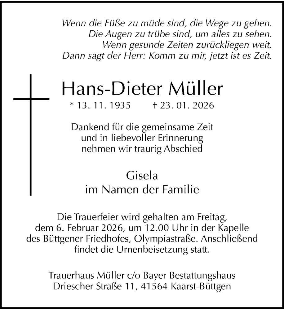 Hier finden Sie alle Traueranzeigen aus der Zeitung, die bisher für Hans-Dieter Müller erschienen sind. Weitere Traueranzeigen, die in der Zeitung erscheinen, werden hier ebenfalls aufgelistet