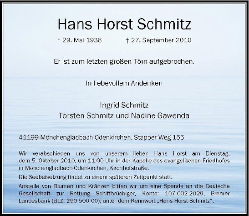 Hier finden Sie alle Traueranzeigen aus der Zeitung, die bisher für Hans Horst Schmitz erschienen sind. Weitere Traueranzeigen, die in der Zeitung erscheinen, werden hier ebenfalls aufgelistet