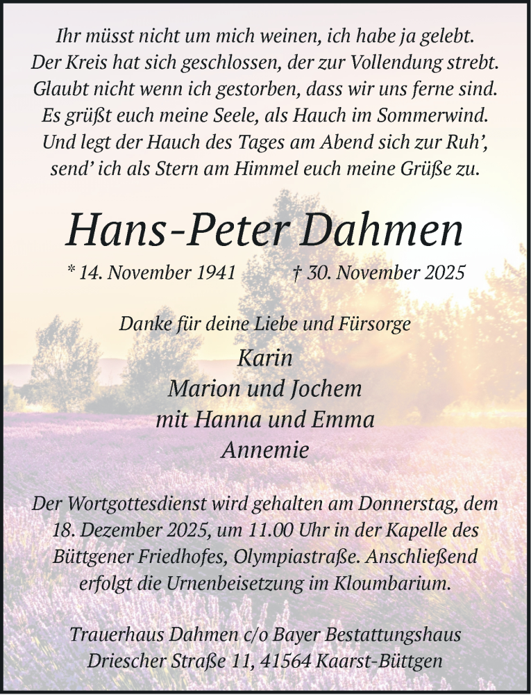 Hier finden Sie alle Traueranzeigen aus der Zeitung, die bisher für Hans-Peter Dahmen erschienen sind. Weitere Traueranzeigen, die in der Zeitung erscheinen, werden hier ebenfalls aufgelistet