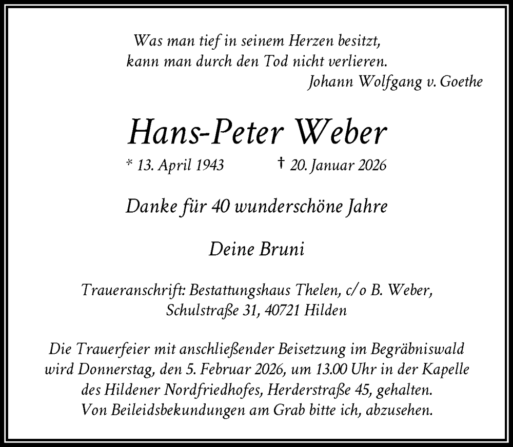 Hier finden Sie alle Traueranzeigen aus der Zeitung, die bisher für Hans-Peter Weber erschienen sind. Weitere Traueranzeigen, die in der Zeitung erscheinen, werden hier ebenfalls aufgelistet