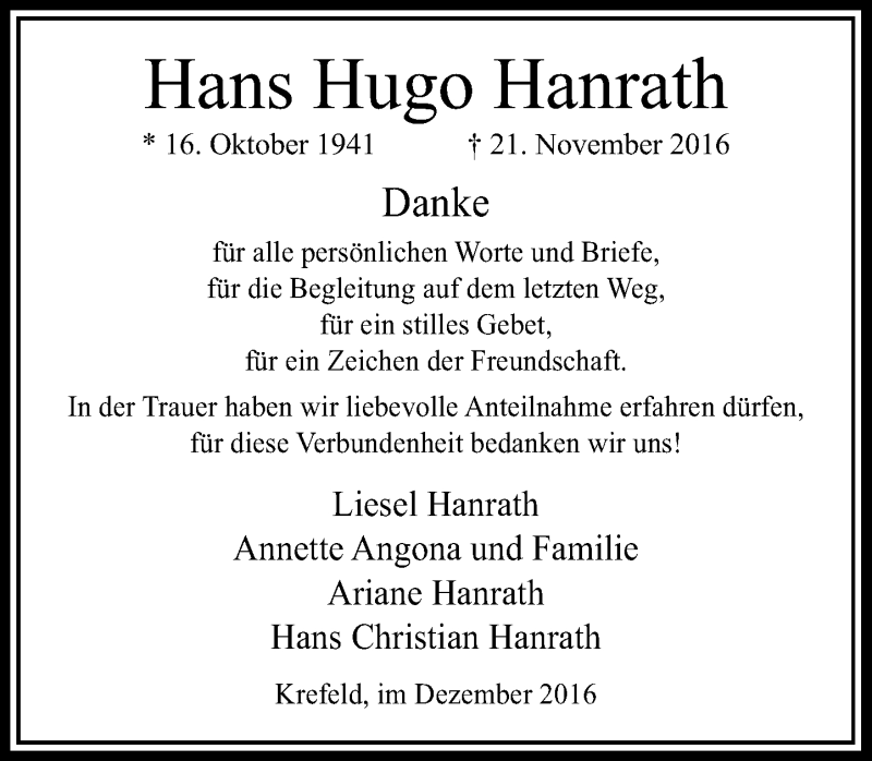 Hier finden Sie alle Traueranzeigen aus der Zeitung, die bisher für Hans Hugo Hanrath erschienen sind. Weitere Traueranzeigen, die in der Zeitung erscheinen, werden hier ebenfalls aufgelistet