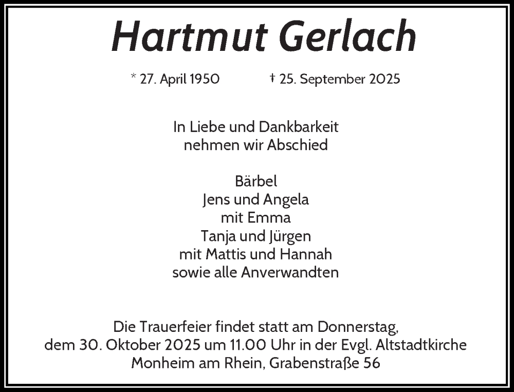 Hier finden Sie alle Traueranzeigen aus der Zeitung, die bisher für Hartmut Gerlach erschienen sind. Weitere Traueranzeigen, die in der Zeitung erscheinen, werden hier ebenfalls aufgelistet
