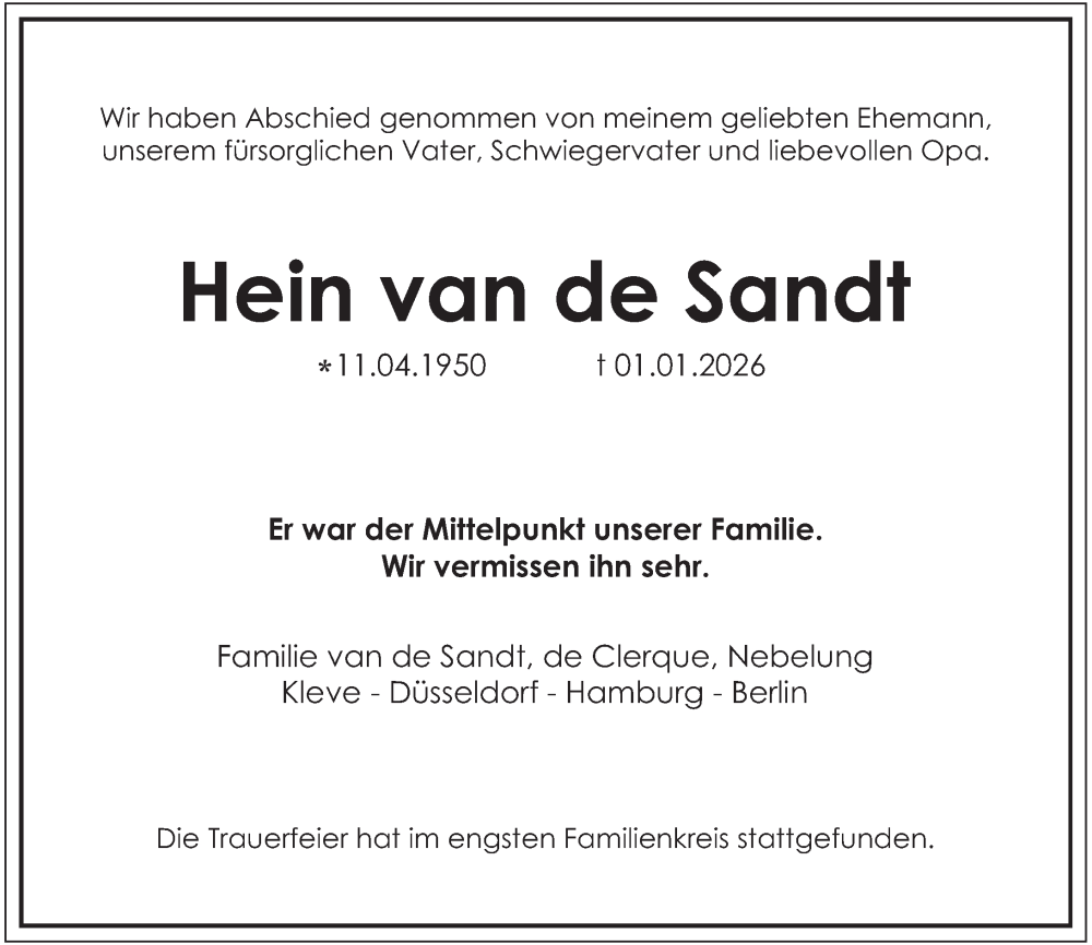 Hier finden Sie alle Traueranzeigen aus der Zeitung, die bisher für Hein van de Sandt erschienen sind. Weitere Traueranzeigen, die in der Zeitung erscheinen, werden hier ebenfalls aufgelistet